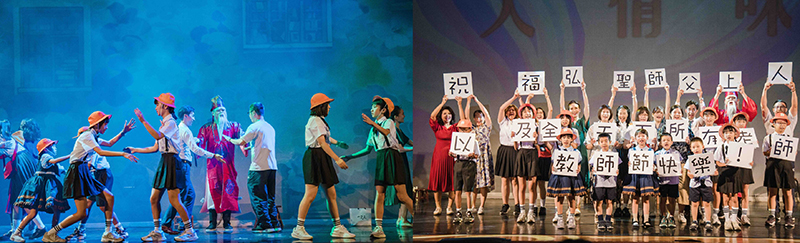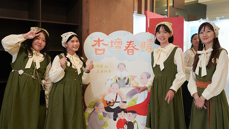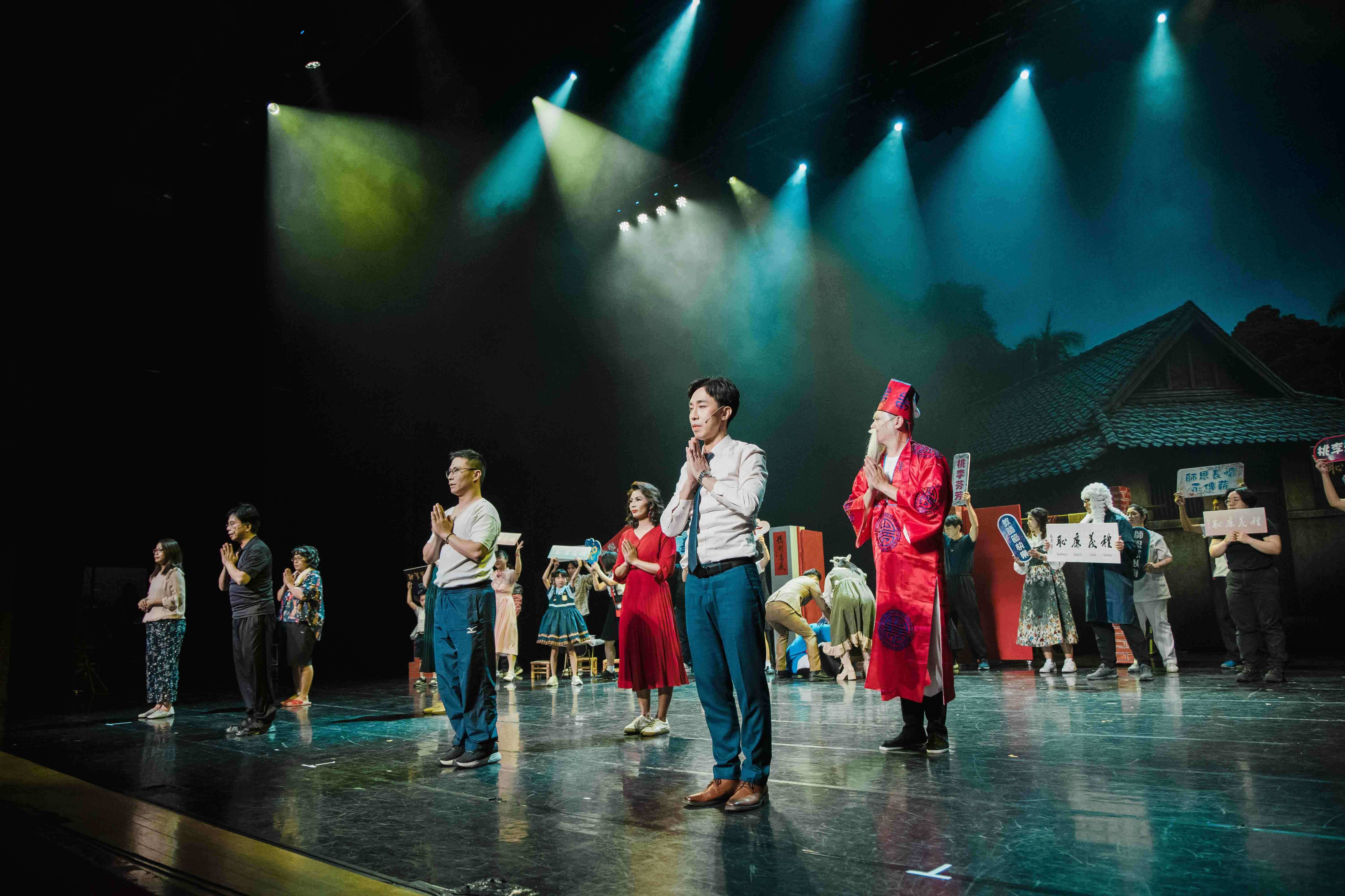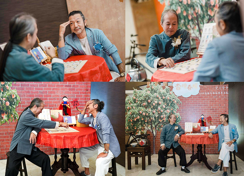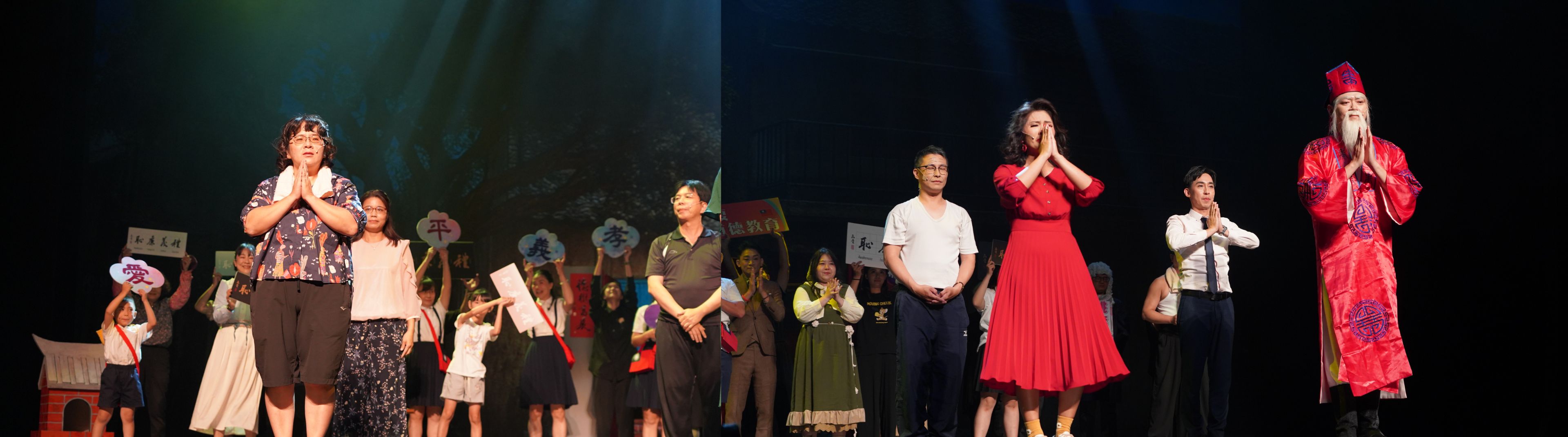 場內、場外皆是驚喜,一踏進了演藝廳,彷彿走入一條既陌生又熟悉的回憶長廊。來訪賓客們開心與卡通人物拍照打卡並領取精心手作的限量紀念禮;接著通過時空門,場景切換至懷舊的老時光。在那個年代的人們,以品德涵養和生命教育為基石,過著互相關懷的生活,社會氛圍踏實溫暖有希望。這些福分的積累,源自於古聖先賢的智慧傳承與庇蔭,讓後人得以在杏樹的繁蔭下安心乘涼,依循正向生命價值觀的標準,守住良知良能的本分。