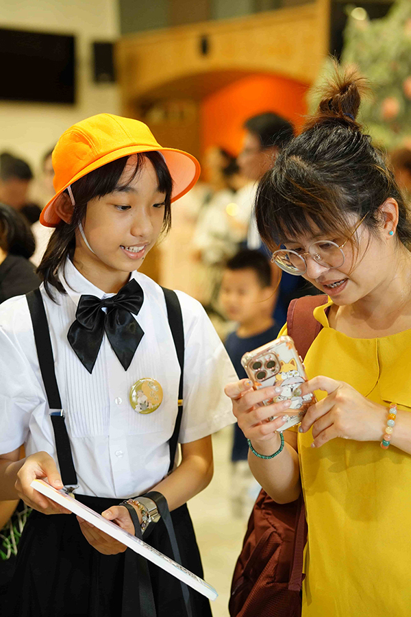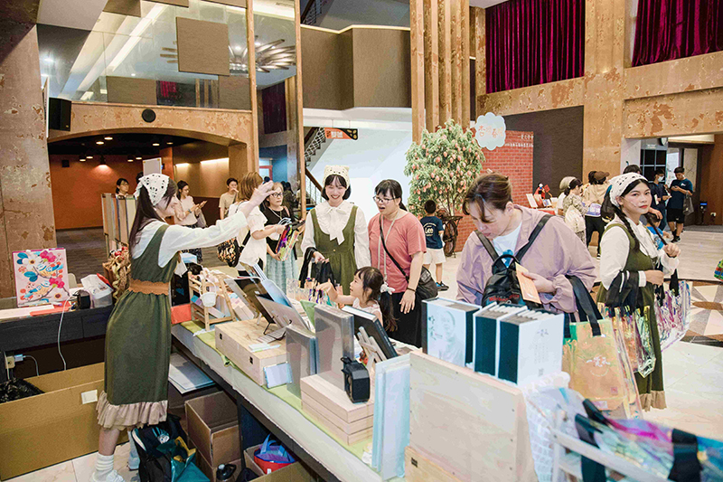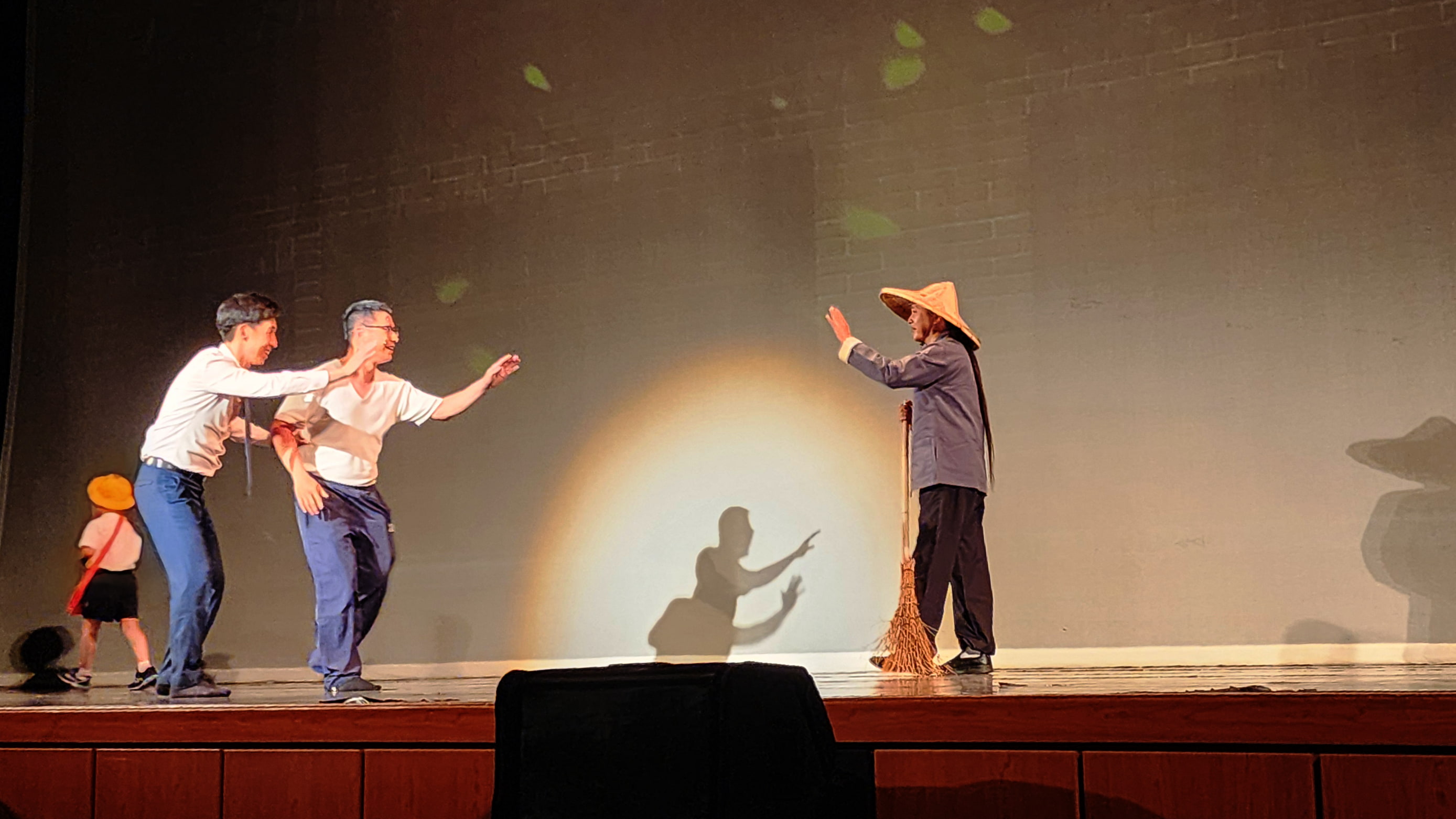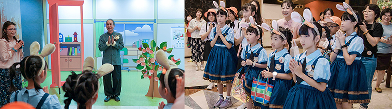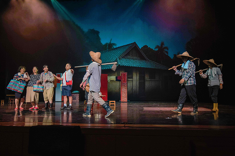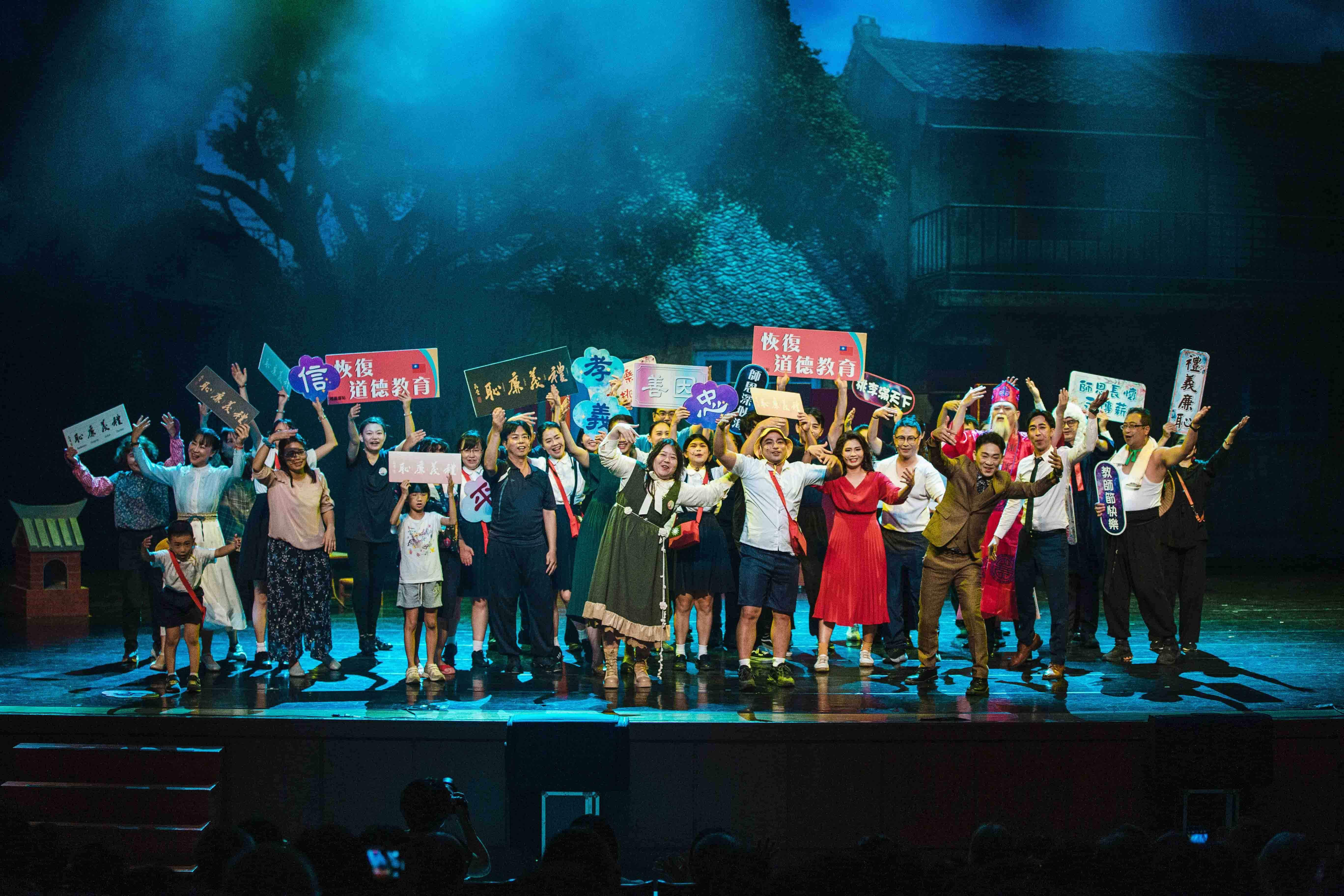 場內、場外皆是驚喜,一踏進了演藝廳,彷彿走入一條既陌生又熟悉的回憶長廊。來訪賓客們開心與卡通人物拍照打卡並領取精心手作的限量紀念禮;接著通過時空門,場景切換至懷舊的老時光。在那個年代的人們,以品德涵養和生命教育為基石,過著互相關懷的生活,社會氛圍踏實溫暖有希望。這些福分的積累,源自於古聖先賢的智慧傳承與庇蔭,讓後人得以在杏樹的繁蔭下安心乘涼,依循正向生命價值觀的標準,守住良知良能的本分。
