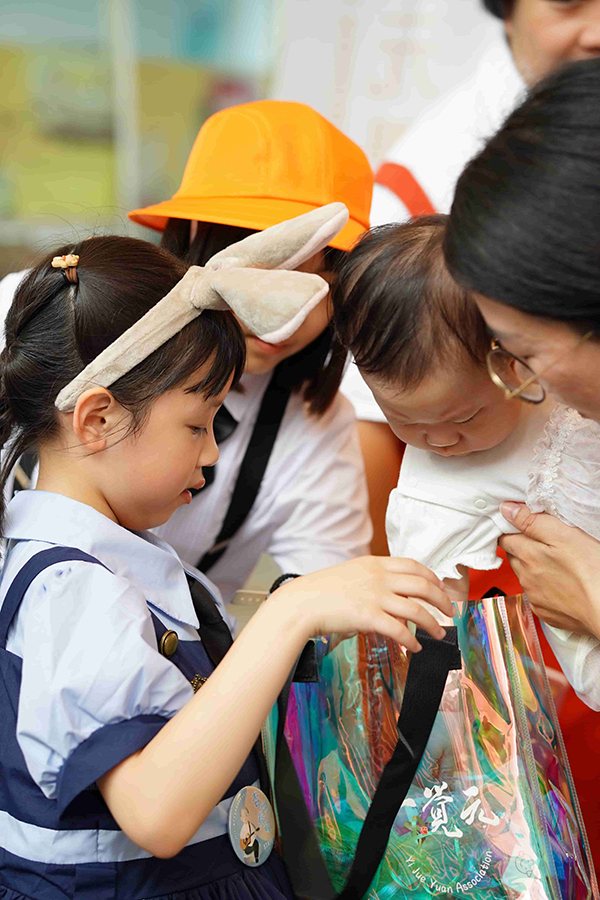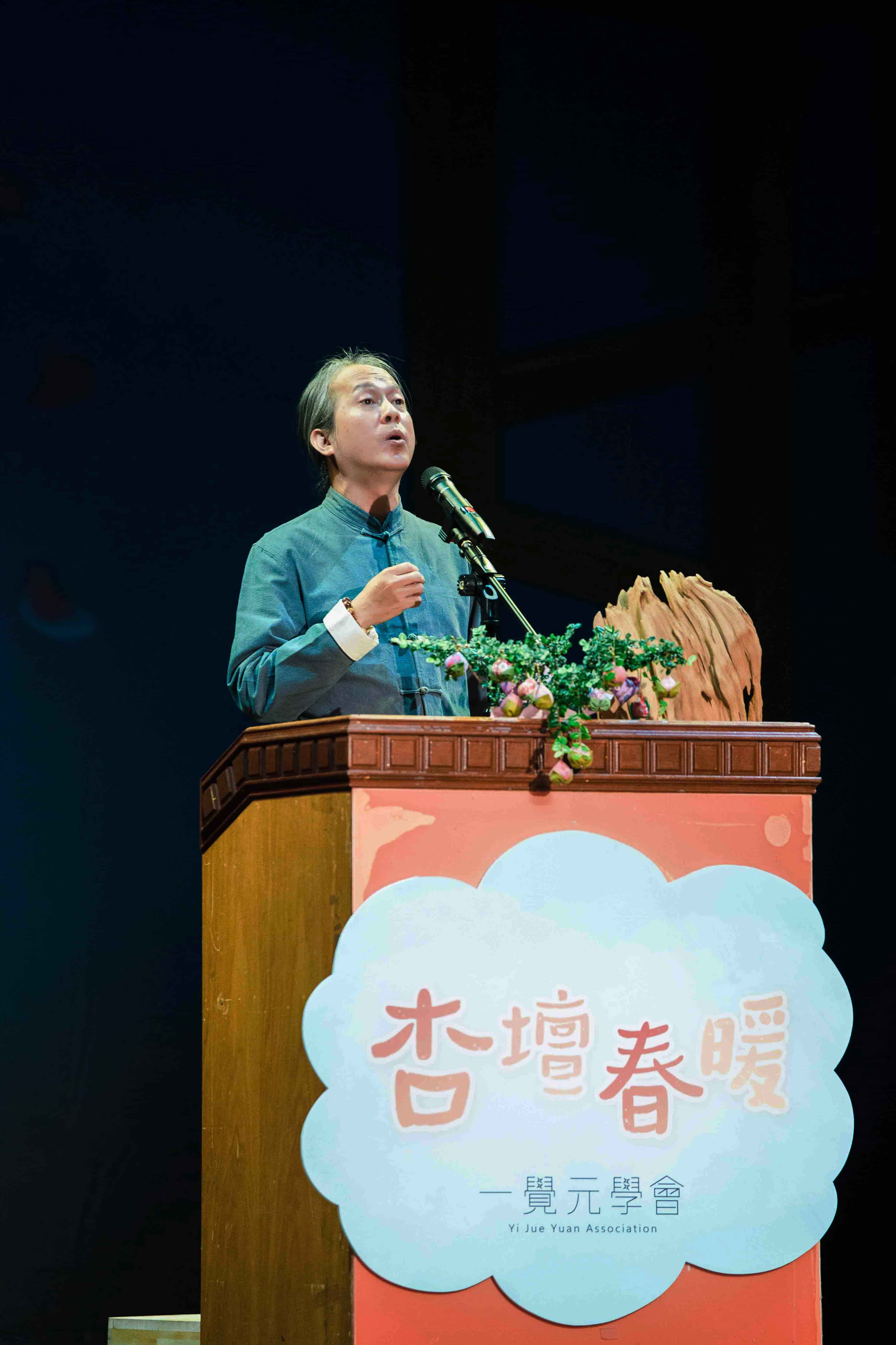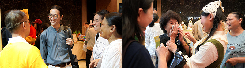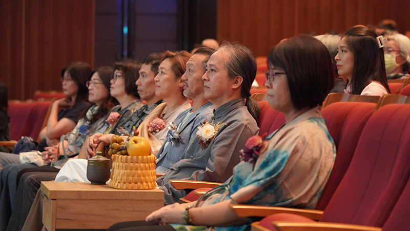 許多賓客早早便聚集於館內,與來自各方的友人相互問候。正當場面越發熱絡之際,場外忽然傳來一陣輕微騷動後轉為寧靜,原來是一覺元的親教師——弘聖師父上人,如清風般翩然到來。大家又驚又喜,恭敬迎接 師父上人親臨。優雅的禮賓生隨即為 師父上人別上胸花,一覺元「童蒙養正班」的孩子們,更是把握這難得機會,向敬愛的 師公獻唱暖心歌曲,並送上親手製作的杏樹立體卡片;樹上一顆顆飽滿的桃子,代替著一個個因 師父上人的教育而重獲新生的家庭,向親教師表達深深的感恩。