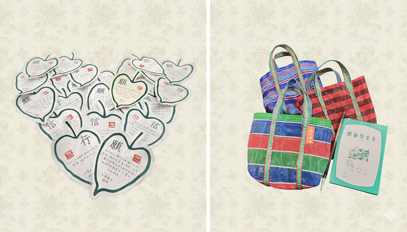 信願行的手工法語菩提葉、復古年代茄芷袋、刻上智慧語錄的毛筆、菩提國小的國語作業簿