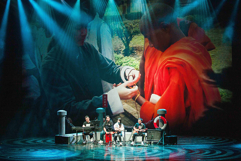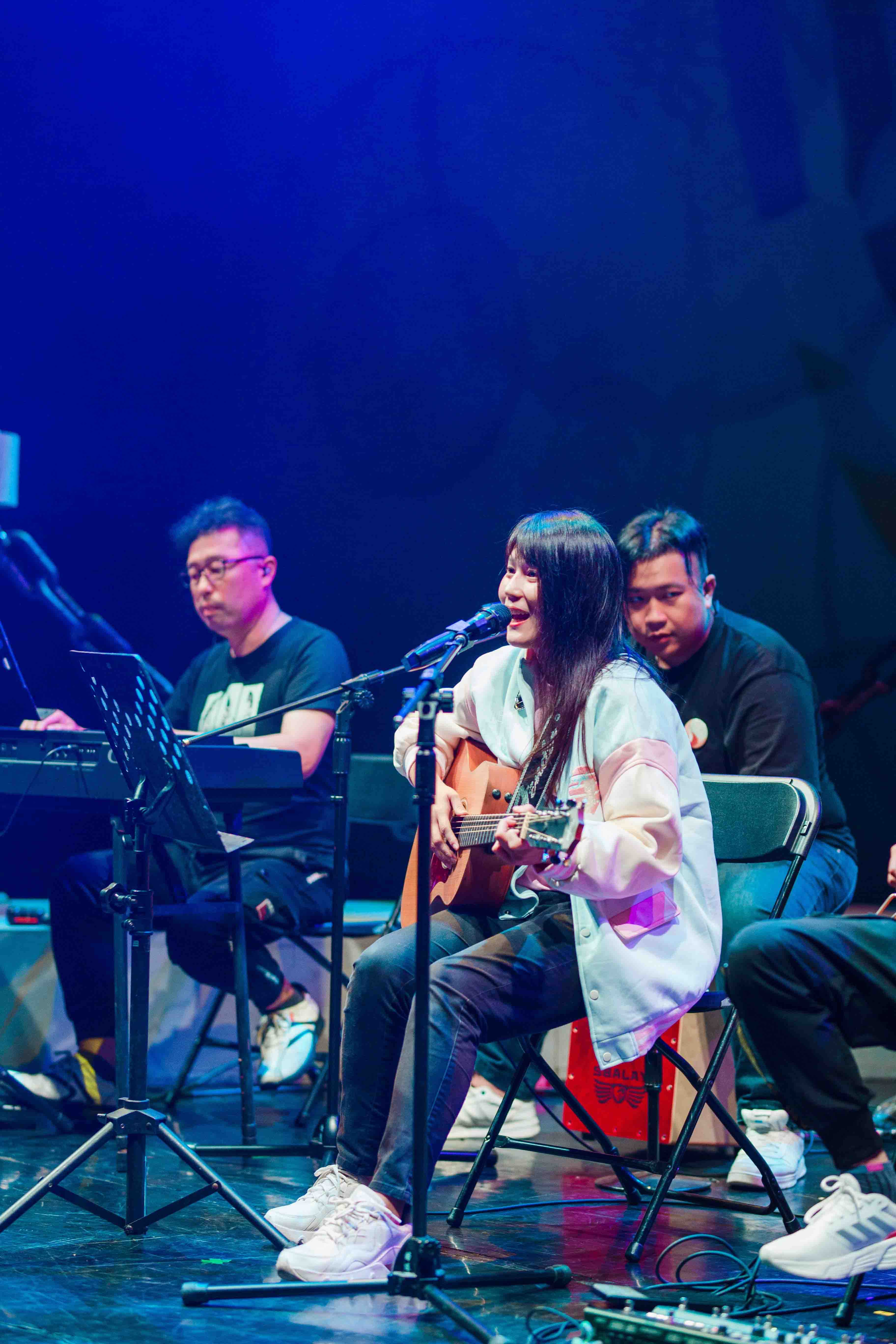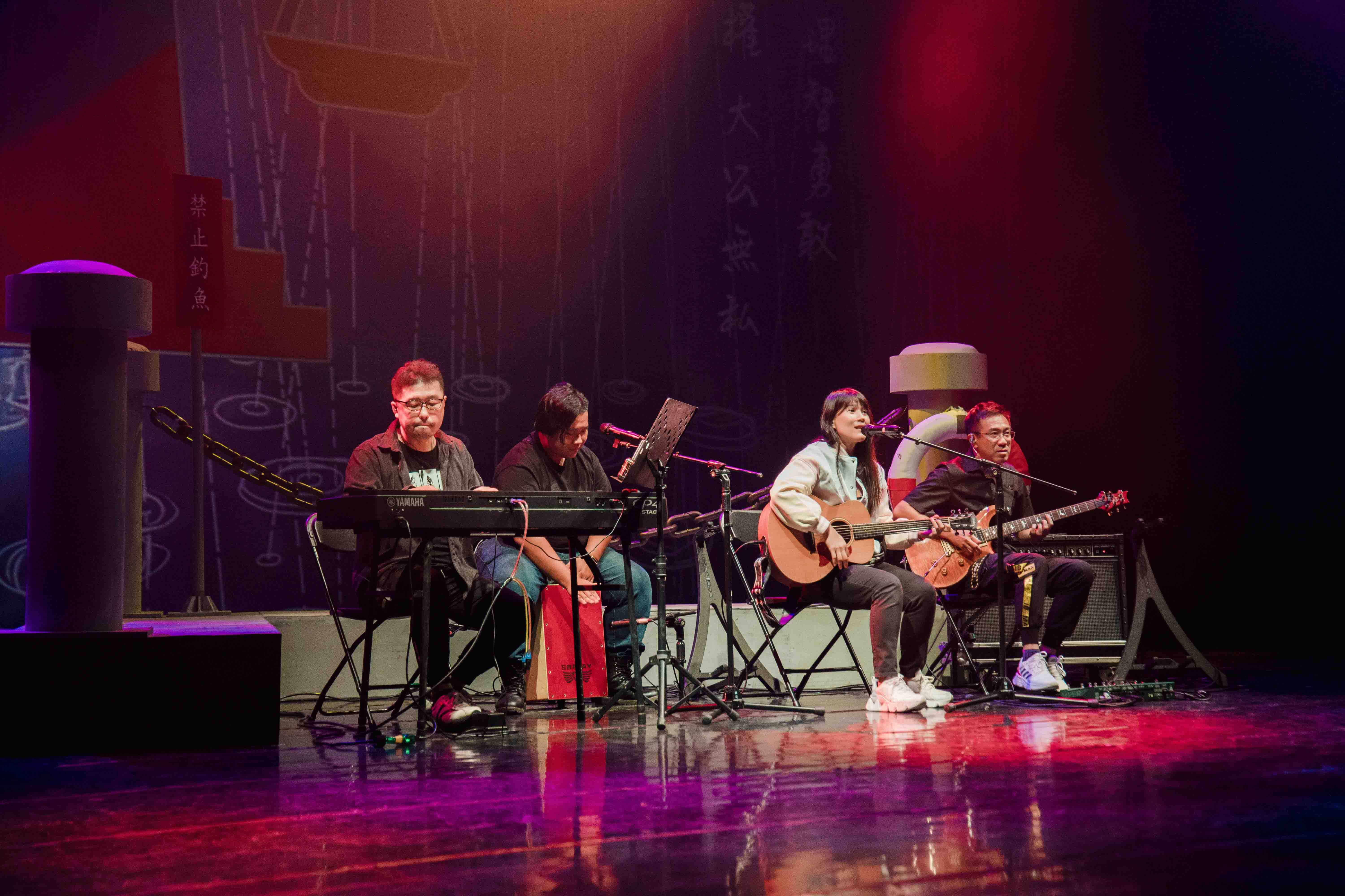 緊接著,主持人小光為大家介紹實力堅强的樂團陣容——在外送平臺與人天兩界都頗具盛名的「世界和平美少女」一覺元才女波芽老師;一覺元佛網平臺指導老師,既是Ai短視頻專家亦是搖滾專家,又幽默到家的阿聰老師;能為您彈歌,也能陪您談心,康康康樂隊御用鍵盤手濱崎老師;既會饒舌還會Beatbox,但今天專注於木箱鼓的祥淯師兄。