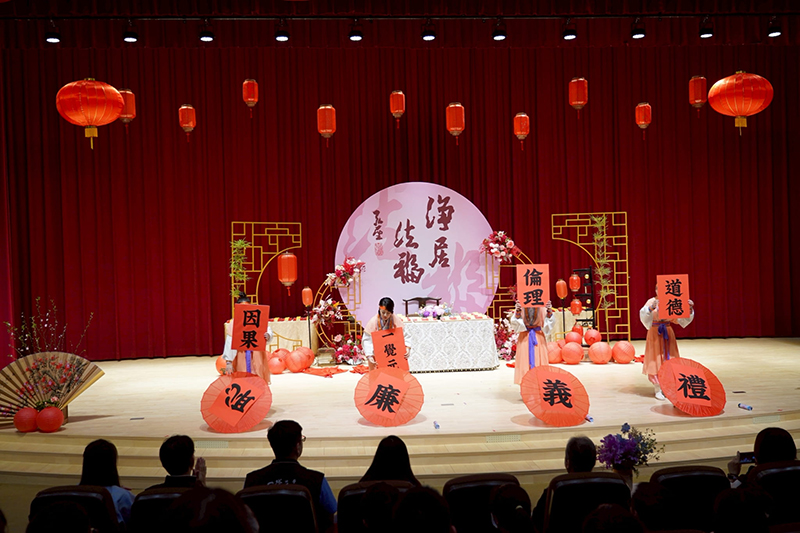 龍天鳳舞賀新春,團拜由學員精心籌備的「龍天鳳舞歸覺元」開場舞揭開序幕,氣氛熱鬧喜慶且深具教育意義,祈願志士仁人共同轉動「禮義廉恥」,落實倫理、道德與因果,為推廣覺悟教育盡一己之力。